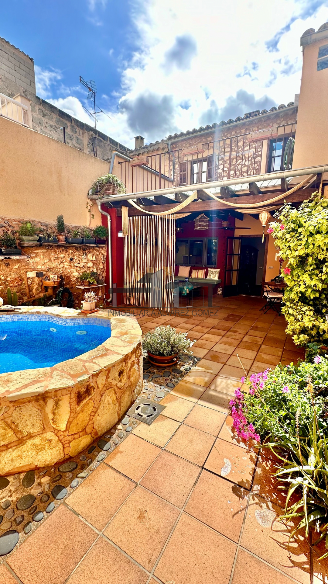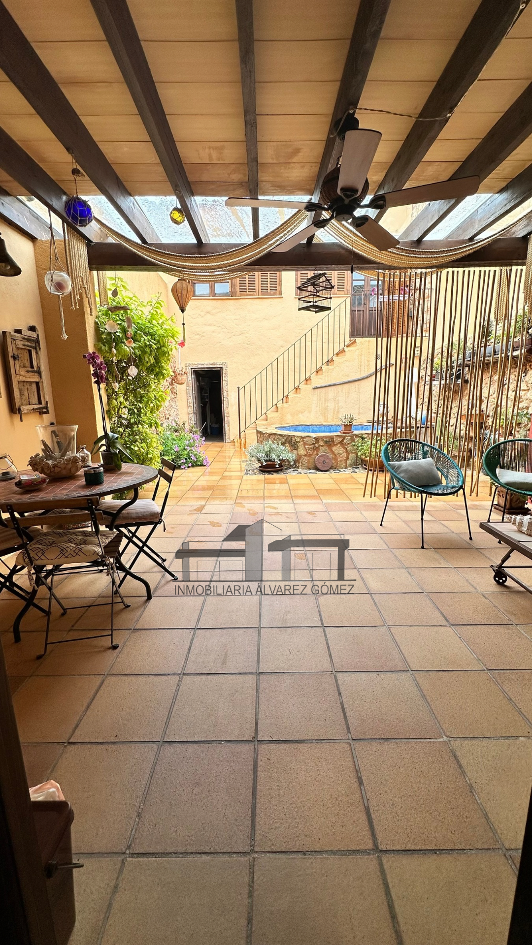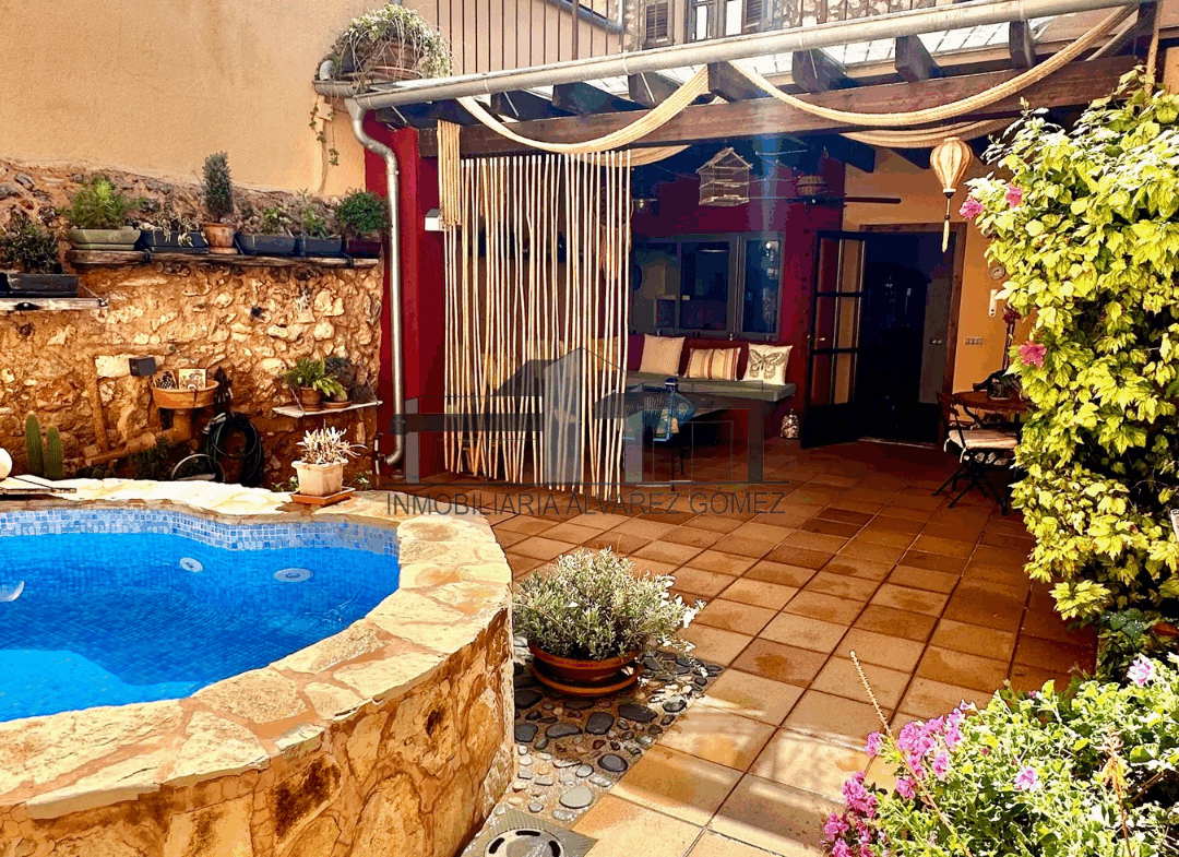 A través del patio, donde se encuentra una zona de terraza con porche y una pequeña piscina, accedemos a la otra parte de la casa.
