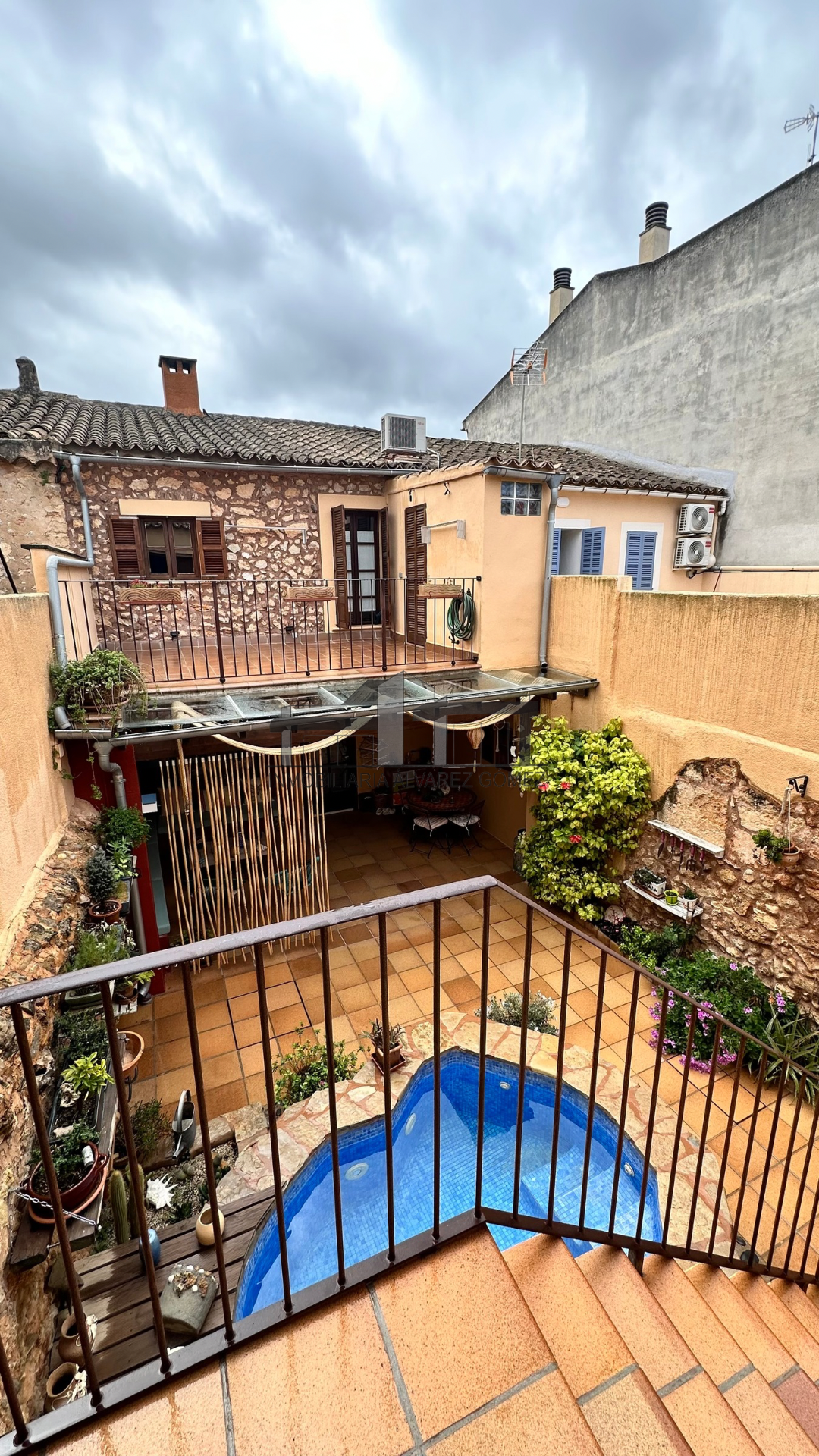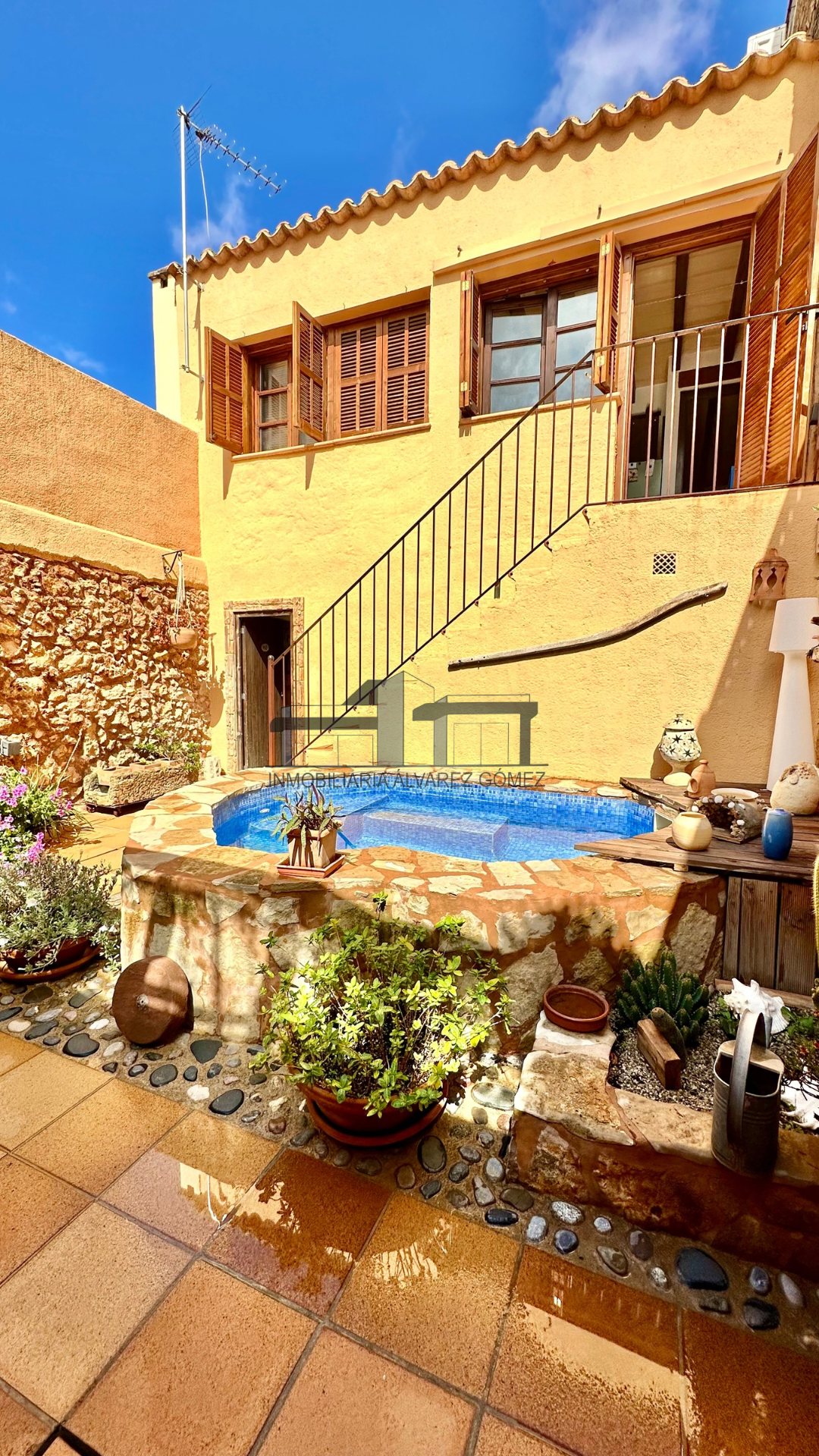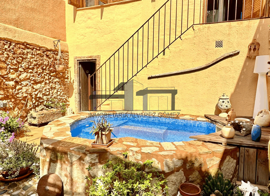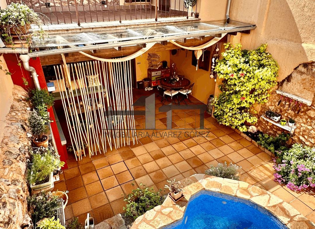 A través del patio, donde se encuentra una zona de terraza con porche y una pequeña piscina, accedemos a la otra parte de la casa.